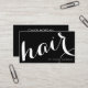 Modern hair stylist script black and white business card. This business card features a script signature on the elegant black background and makes a perfect accent to your business. Ideal for hairstylists.