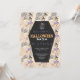 Hexagonal dark grey coffin shape and witches on brooms pattern with a witch with hat making a pale orange, purple, black and peach modern trendy and simple Halloween bash party invitation. Suitable for scary funny witches Halloween parties.