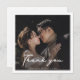 Celebrate and share your cherished wedding memories with our personalised photo thank you card. Featuring your chosen couple’s photograph as its centerpiece, this card beautifully captures the essence of your special day. Accented with an elegant script "Thank You" positioned gracefully across your image, this card blends sentimentality with style. Perfect for expressing your gratitude to friends and family in a way that’s both intimate and memorable, it's an exquisite token of a day filled with love.
