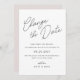 Custom-designed vertical wedding postponement/change the date card featuring modern black and white hand lettering design on the front, coloured background on the back.