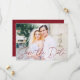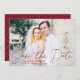 Announce your wedding date in style with our trendy modern photo save the date cards. The design displays your full-bleed horizontal engagement photo with "Save the Date" in a burgundy handwritten script overlay with an optional white gradient. Personalise the front of the save the date photo card by adding your names, wedding date, and wedding location. The simple save the date photo card reverses to a burgundy and white dotted geometric pattern.