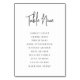 Simple and chic table number cards in classic black and white make an elegant statement at your wedding or event. Design features "table [number]" in handwritten script lettering, with individual guest names below in timeless serif typography. Design repeats on both sides.