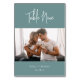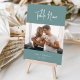 Simple and chic table number cards in dusty teal and white make an elegant statement at your wedding or event. Design features "table [number]" in handwritten script lettering, two additional lines of custom text along the bottom (shown with your names and event date). Personalize with a favorite photo for a sweet personal touch. Design repeats on reverse side.