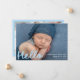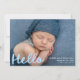 Welcome your little one with this sweet and modern photo birth announcement featuring your baby's horizontal photo and the word "Hello" in a cheerful sky blue handwritten script. Personalise the front with your baby's name, birth date, and birth stats for a heartfelt introduction. The back includes a collage of six square photos with space below to share your family’s names—a charming and stylish choice, perfect for celebrating baby boys.