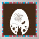 Happy Easter illustration featuring a simple minimalist Easter egg coloured with silhouettes of a rabbit, butterfly, flowers and Easter greeting on a chocolate brown background with a striped frame.