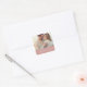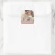 Soft and romantic wedding favour stickers featuring the word "Love" in delicate heart script calligraphy with a custom couple's photo on a warm toned muted pink background. The elegant square format is ideal for favour boxes, gift bags, or envelope stickers at your wedding or bridal shower celebration. All text and photo are fully customisable.