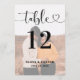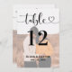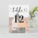 Modern black and white (colours can be modified) wedding table number cards feature a photo of the couple with a stylish black typography design overlay that includes chic calligraphy script and a heart accent. The simple and elegant custom text that can be personalised with the table number and guest names seated at that particular table. Customise and add each individual table number card needed (1, 2, 3...and so on) to your shopping cart.