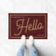 Modern Hello Burgundy Gold Script Family Name Doormat
