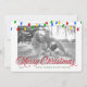 This contemporary holiday card features an illustration of strings of bright Christmas lights in red, green, yellow and blue, spanning the top edge of the card. In the centre is a place for your photograph and below, in red script typography, are the words 'Merry Christmas'. Personalise the front with the year, your name, or other custom text - just use the easy, provided templates. The back side is printed with a cheerful red and white sketched dot pattern.