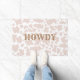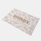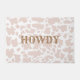 Trendy modern cowgirl or cowboy doormat for student, dorm room, with beige and white cow spots and howdy greeting. Cow animal print in modern colours