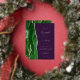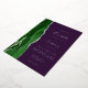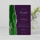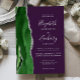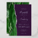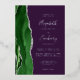 The left-hand edge of this elegant modern wedding invitation features a hunter green watercolor agate border trimmed with faux silver glitter. The customizable text combines handwriting, copperplate and italic fonts in real silver foil on a deep purple background. The reverse side features a matching green and silver agate design.