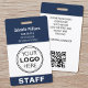 Create a professional appearance with a branded staff ID badge. This editable template can be personalised with your name, job title, location, employee number, and company logo. Return details are on the back, along with additional information, and a QR code. Perfect for creating a cohesive branding experience, or simply to verify the identity of the wearer and display their qualifications. This identification badge is ideal for customer-facing roles and corporate settings — from business consultants and retail stores to medical professionals, hospital staff, office workers, conference teams, corporate events and more. Custom badges build brand identity and enhance security. Printed colours: very dark navy blue, grey and white. Vertical format.