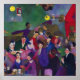 Impressionist vision of a crowded bar.  Various sizes available.  A group people in a bar is captured in this image. The walls of the bar are painted red with green accents, and a bright yellow circle with a dark brown centre is in the foreground. On the far left wall of the bar hangs a painting of a man and a woman, while on the far right is a painting of a woman in purple. The people in the bar are talking and laughing, creating a warm and inviting atmosphere.