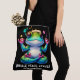 Inhale Peace, Exhale Hop-Piness funny, cute frog is practicing meditation and reflecting on the importance of just breathing. Colourful in green and pink, on a tote bag.