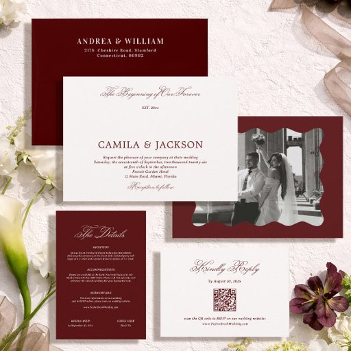 Modern Ivory and Burgundy Wedding RSVP Qr Code Enclosure Card