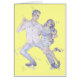 A colour pencil and pen illustration in a cartoon style of a couple in the middle of a modern jive move. A guy with dark curly hair and a light purple button down shirt that has the sleeves rolled up, blue denim jeans and dark blue shoes dances with a beautiful petite young woman wearing a dark blue striped dress and high heeled shoes. The girl has long flowing dark brunette hair.