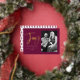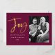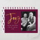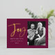 Modern foil holiday card featuring "Joy" in hand-lettered gold foil script with a berry purple background. Personalise the front of the card by adding your favourite vertical photo, custom greeting, name, and the year. The reverse side of the card features a berry and white modern Christmas tree pattern.