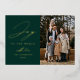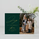 Modern holiday photo card featuring the phrase "Joy to the World" in elegant gold foil script with a spruce green background. Personalise the front of the elegant holiday card with your family name, year, and vertical photo.
