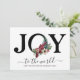 A unique modern Christmas card featuring illustrated JOY black serif typography and adorned with holy berries, greenery, pine needles and flowers with a string of sleigh bells. Personalise below with your family name and happy holidays or whatever phrase you prefer.