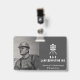 Custom Photo ID badge for your land surveying/mapping/development company, features white land survey icon with customisable text on dark grey background .