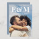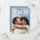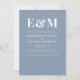 Modern save the date wedding announcement that features your monogram initials in large bold white typography overlaying your photo. Customise your save the date details on the back in simple and elegant white typography on a dusty blue background. If you need to darken the top portion of your photo for the white text to show, there is a dark gradient that you can turn on by editing in the design tool.