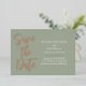 These save the date cards feature a modern, and elegant design on a sage green background. "Save the Date" is printed in gold foil, with a large font in a script, handwritten style. The wedding or event information is printed on the right.