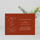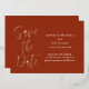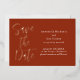 These save the date cards feature a modern, and elegant design on a terra cotta background. "Save the Date" is printed in gold foil, with a large font in a script, handwritten style. The wedding or event information is printed on the right.
