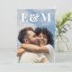 Modern save the date wedding announcement that features your monogram initials in large elegant white typography overlaying your photo. Customise your save the date details on the back in simple lettering. If you need to darken the top portion of your photo for the white text to show, there is a dark gradient that you can turn on by editing in the design tool.