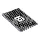 This modern, trendy notebook features a white geometric lattice all-over design with a black background. In the centre is a framed monogram letter in black.