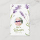 Funeral memorial prayer card featuring a photo of the deceased, name, dates, and elegant lavender flowers on the front. The back has a verse from the bible that can be changed to any prayer, poem or message.