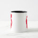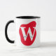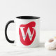 Modern monogram design in a bold serif typography is layered underneath a name in a handwritten-style script font with elegant flourishes. The same design automatically appears on both sides when you personalise it. The bright red abstract shape in the background adds a wonderful pop of colour! Great gift for holidays, work coffee events, wedding parties and more!