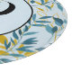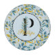 Beautiful design features background of blue and gold leaves on light blue background with monogram/ initial P with leaves embellishment in centre circle. Personalise with name in yellow gold colour script font