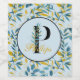 Beautiful design features background of blue and gold leaves on light blue background with monogram/ initial P with leaves embellishment in centre circle. Personalise with name in yellow gold colour script font