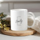 Custom-designed modern style coffee mug featuring black and white initial and hand script name.