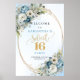 Welcome guests in style with this elegant Sweet Sixteen welcome sign featuring watercolor dusty blue flowers, soft eucalyptus greenery, and a shimmering gold glitter frame. Designed in chic boho style with romantic script lettering, this floral welcome poster creates a stunning entrance display. Perfect for modern, luxury, or garden Sweet 16 celebrations, it adds a coordinated and memorable party backdrop.