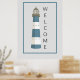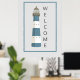 Modern welcome flag features simple lighthouse design, vertical text and thin blue border frame on light gray  background.  Perfect for vacation cottages, seafood shops and other nautical / marine or Cape Cod  decor themes