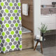 This shower curtain features a colourful geometric hexagon pattern in lime green and grey.