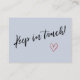 Keep your friends and family up-to-date with your new address using these simple, elegant enclosure cards. You can insert them into your mailings or share them in person, as you run into people you need to notify. When you want a distinctive method for letting your tribe know how to find you, this card is versatile enough for anyone. It features pretty typography graphics that read "We've Moved" on the front and "Keep in touch!" on the back, using a modern, casual, handwritten script font. I've placed a little house illustration on the front and red watercolor heart outline on the back, adding a distinctive touch. Use the template fields to add all your own details to personalise this design for your own use. If you'd like to change the pretty, simple sans-serif font I used for the editable text, or wish to move some lines elsewhere, click the link to customise the card further. The black type was placed over an editable pale dusty blue background; you can change this to any colour you wish. // 90 //