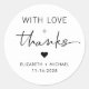 Modern thank you sticker for your wedding reception favours and thank you cards featuring "With Love + Thanks" in simple typography and a stylish chic script, and your names and wedding date.