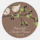Cute love birds Bridal Shower round sticker featuring bride & groom birds sitting on a branch with green flowers set on a chocolate brown background. Great for bridal shower favour tags & envelope seals! Customise with your bridal shower information and you're all set to go! Matching invitations and postage stamps available in our shop www.celebrateitinvites.com.