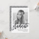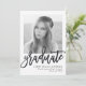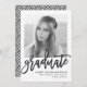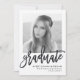 Invite friends and family your graduation party with a chic, modern graduation party invitation. The design features a trendy script font, placeholders for an image and custom text, and a black and white art deco pattern on the back.