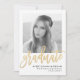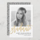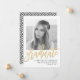 Announce your graduation with a chic, modern graduation announcement. The design features a trendy script font in a faux gold foil style, placeholders for an image and custom text, and a black and white art deco pattern on the back.