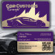 Make a lasting impression with this luxurious and customisable business card. The front showcases a stunning, engraved-style depiction of a modern car in metallic gold and deep purple. The business name, "Car Customs Concept," is elegantly rendered in a combination of sans-serif and script fonts with an engraved effect. The back features a stylish deep purple and metallic gold layout with fully customisable fields and a QR code for seamless online engagement. Whether you specialise in car customisation, detailing, sales, or repair, this luxurious card will leave a memorable mark.