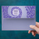 This envelope design radiates elegance with its ornate purple damask floral frame gracefully flowing around the centre. The intricate swirls, leaves, and ornamental flourishes in deep purple stand out beautifully against the dark background, giving the design a regal and artistic appeal. At the centre, the recipient’s name and address are highlighted in matching purple, blending seamlessly into the luxurious theme. The rich purple palette adds sophistication and charm, making this design ideal for weddings, anniversaries, gala dinners, and other formal celebrations.