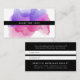 Encourage your customers and clients to share the love with these chic watercolor referral business cards. Front features a single line of custom text in white on black, on a watercolor paint blot backdrop in bright hues of fuchsia pink, magenta, and purple. Add your contact information and referral terms to the reverse side using the template fields provided. Includes space for the referrer's and new customer's names.