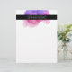Elegant modern letterhead design displays your name and/or business name with two lines of contact information in white on a black stripe, overlaid on a watercolor inkblot element in fuchsia pink, magenta, and purple.