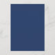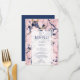 This elegant, modern wedding menu features a navy blue, blush and gold marble background. The text appears in simple, modern navy blue sans serif font on a white semitransparent rectangle aligned with the bottom of the card. The back of the menu is solid navy blue.