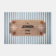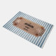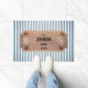 This custom doormat features seashells and boat wheels surrounding four lines of custom text in elegant black letters on a striped blue and white striped pattern. Customise with your information or make it a gift to remember.