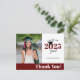 This photo graduation thank you postcard offers a custom photo frame and accented with a colour block style of maroon and white. Class of 2025 appears with graduation cap sitting on top of the "0".