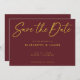 Modern maroon background and golden handwritten style wedding Save the Date invitation card. This design features large calligraphy style font that you can change its colour. You can also customise all details and colours on this Save the Date design.